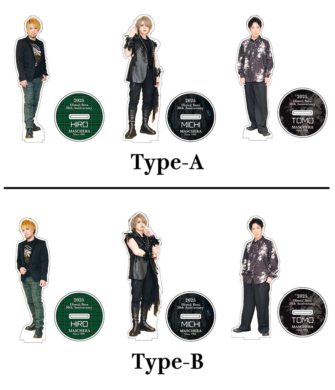 姫路Beta設立30周年ライブ「Novastalgia - ノヴァスタルジア」出演時衣装ver.のMICHI / HIRO / TOMOのアクリルスタンド3体セットです。パーツ構成は、①人物 ②台座 の2ピースとなっており、ポーズはType-AとType-Bよりお選びいただけます。
